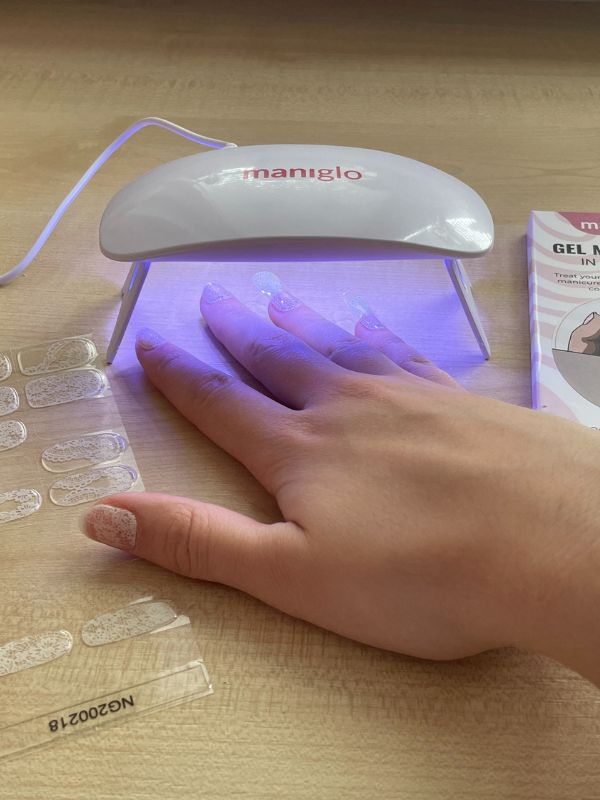 4. Vlož ruku pod UV lampu na 60 sekund, čímž nehty zpevníš a dodáš jim luxusní lesk. Následně jemně pilníkem vyhlaď okraje nehtů.